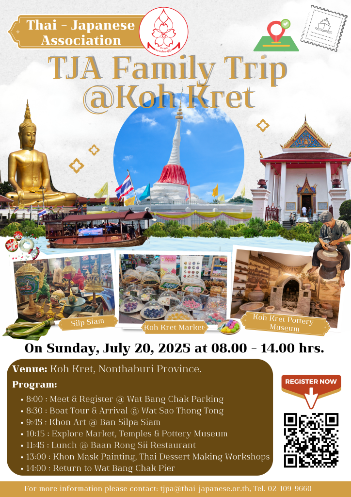 We are pleased to invite you and your family to join our special cultural outing: “TJA Family Trip @ Koh Kret” on Sunday, July 20th, 2025 — a wonderful opportunity to enjoy a relaxing day, deepen connections among members, and explore the charming local culture and handicrafts of Koh Kret, Nonthaburi.